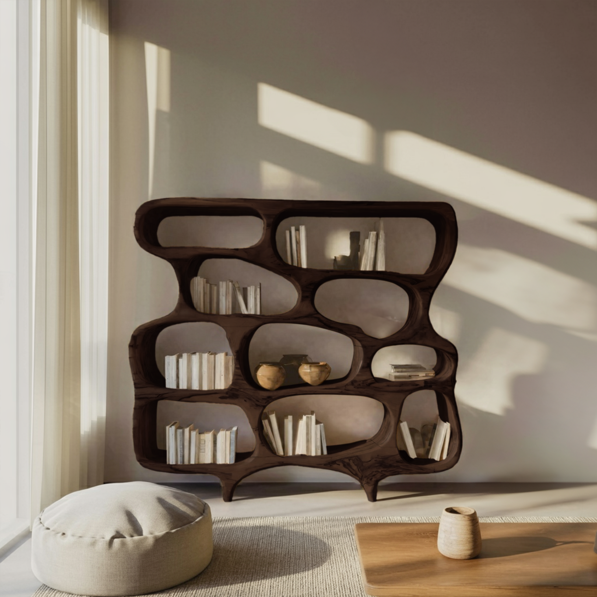 This bookshelf features an organically shaped silhouette with interconnected open compartments that flow seamlessly from one to another. The gently curved outlines create a soft, dynamic appearance, adding depth and movement to the room. With shelves of varying proportions, it offers versatile storage while keeping an airy, contemporary aesthetic.