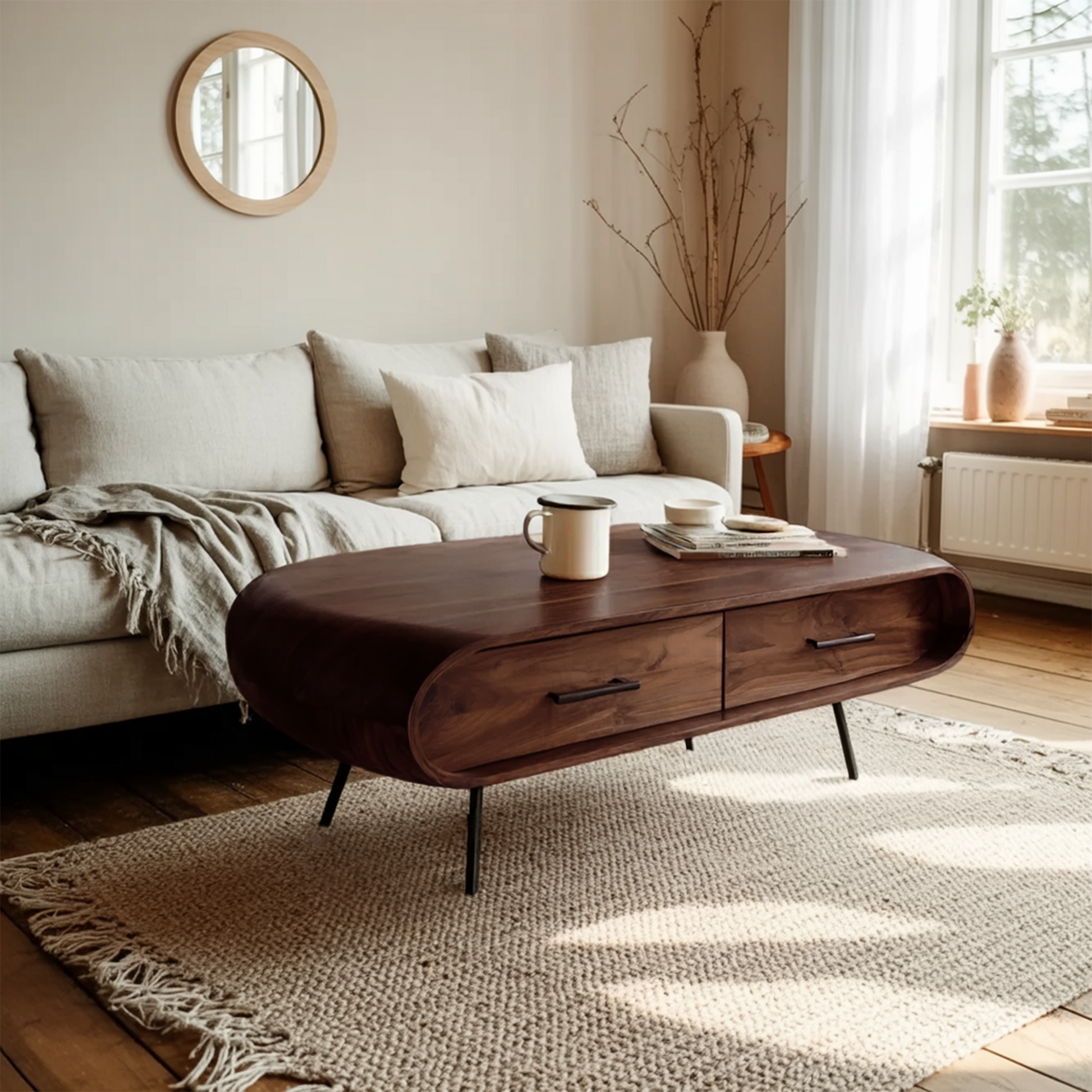 Add a touch of sculptural elegance to your home with our Modern Round Coffee Table With Drawer For Living Room, designed to balance form and function in one refined piece. With its curved edges and seamless silhouette, this table enhances your interior with a sense of warmth, flow, and understated sophistication.