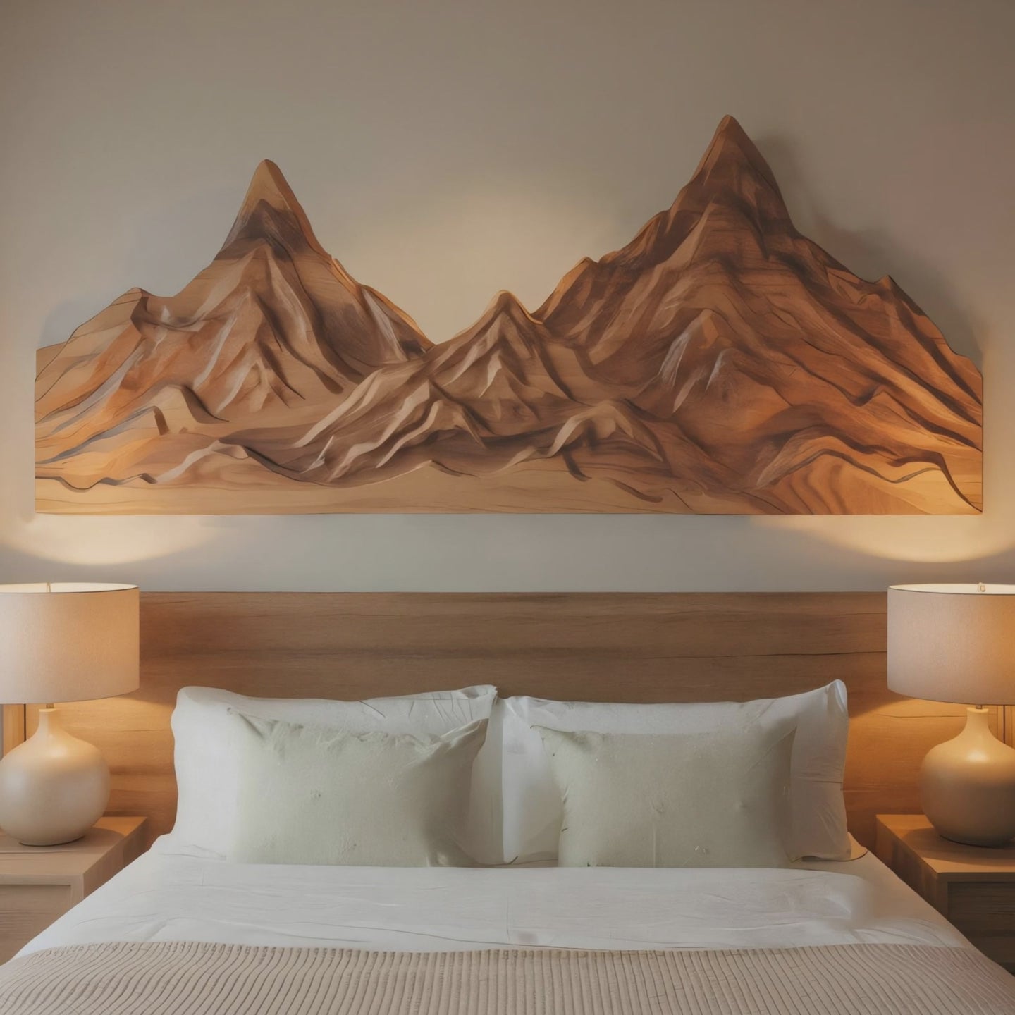This wall‑mounted sculpture showcases hand‑carved mountain ridges, preserving the wood’s live edge and organic contours. The three‑dimensional relief casts subtle shadows and evokes the majesty of rugged landscapes, making it a striking yet harmonious addition to both bedroom and living room interiors.